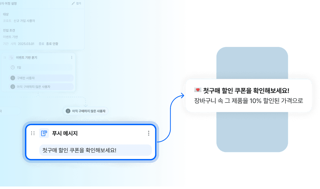 드래그 앤 드롭 방식의 빌더로 손쉽게 여정을 설계하고, 장바구니 이탈이나 앱 미방문 등 행동 조건에 따라 맞춤 메시지를 자동 발송하세요.